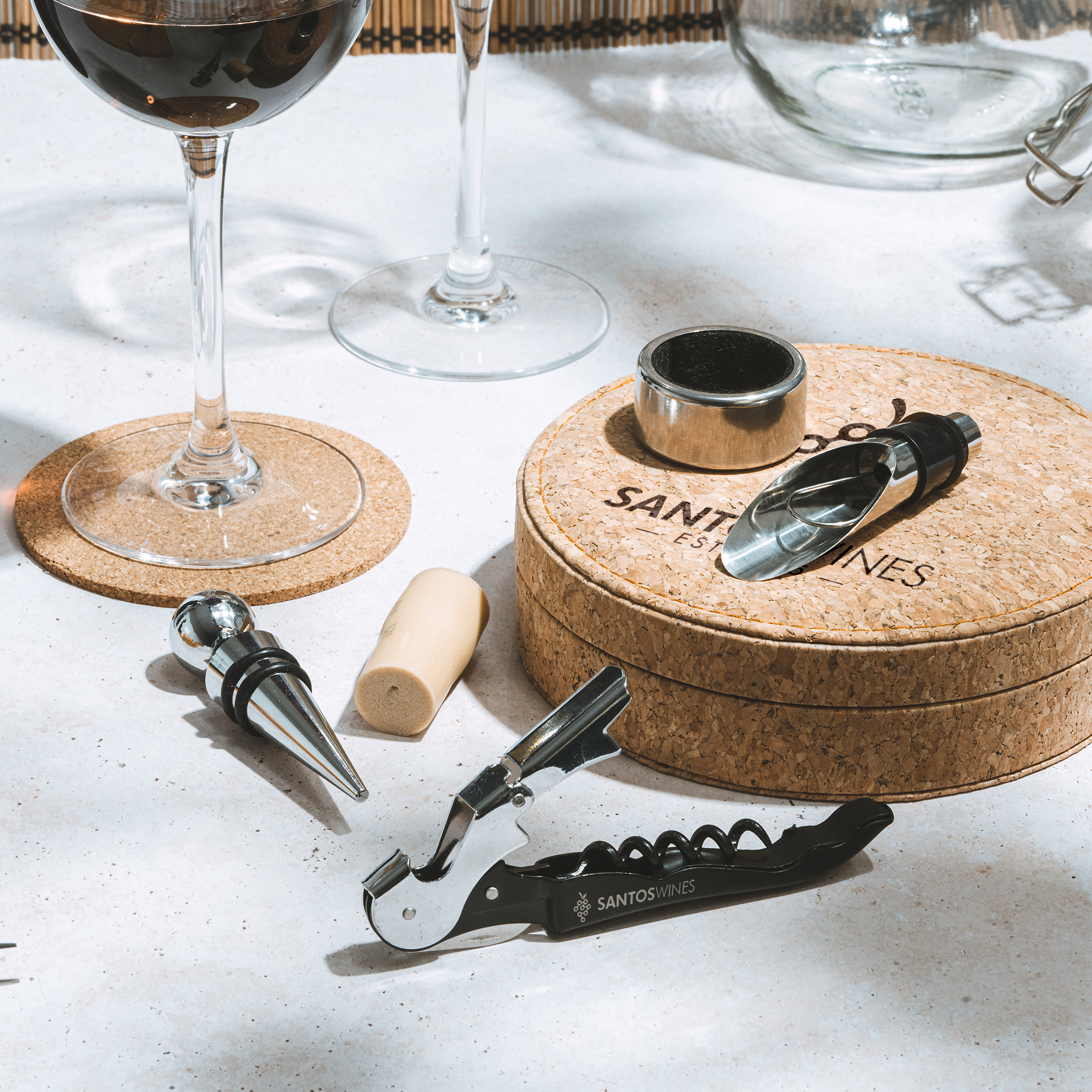 Набор для вина с аксессуарами из нержавеющей стали: штопор с двойным рычагом и складным лезвием, кольцо для капель, носик для наливания и пробка. Представлен в футляре из натуральной пробки с внутренней прокладкой и коробкой с эко-дизайном.- Виды нанесений: Гравировка CO2-А1, УФ-печать, Тампопечать большая, УФ-Лак, УФ-Цвет+Лак