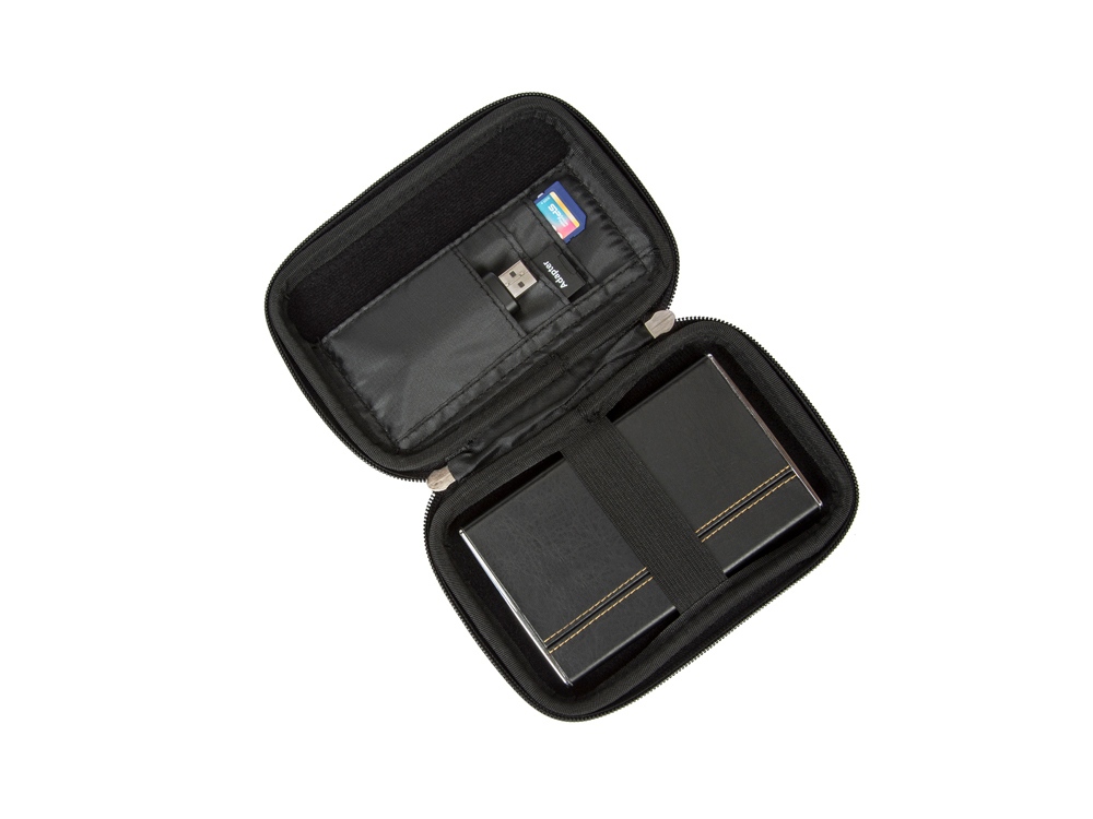 • Устройство надежно крепится внутри чехла специальной фиксирующей лентой, кроме того предусмотрены дополнительные внутренние карманы для кабеля, карт памяти и аксессуаров.