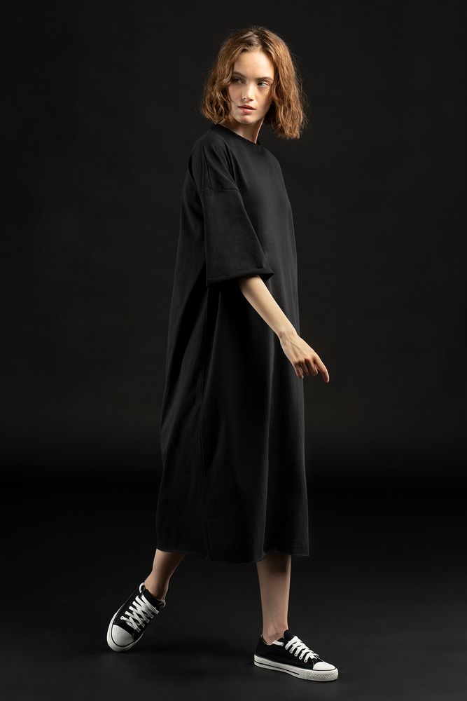 Платье свободного кроя со спущенным плечом.- Воротник из основного полотна тон в тон