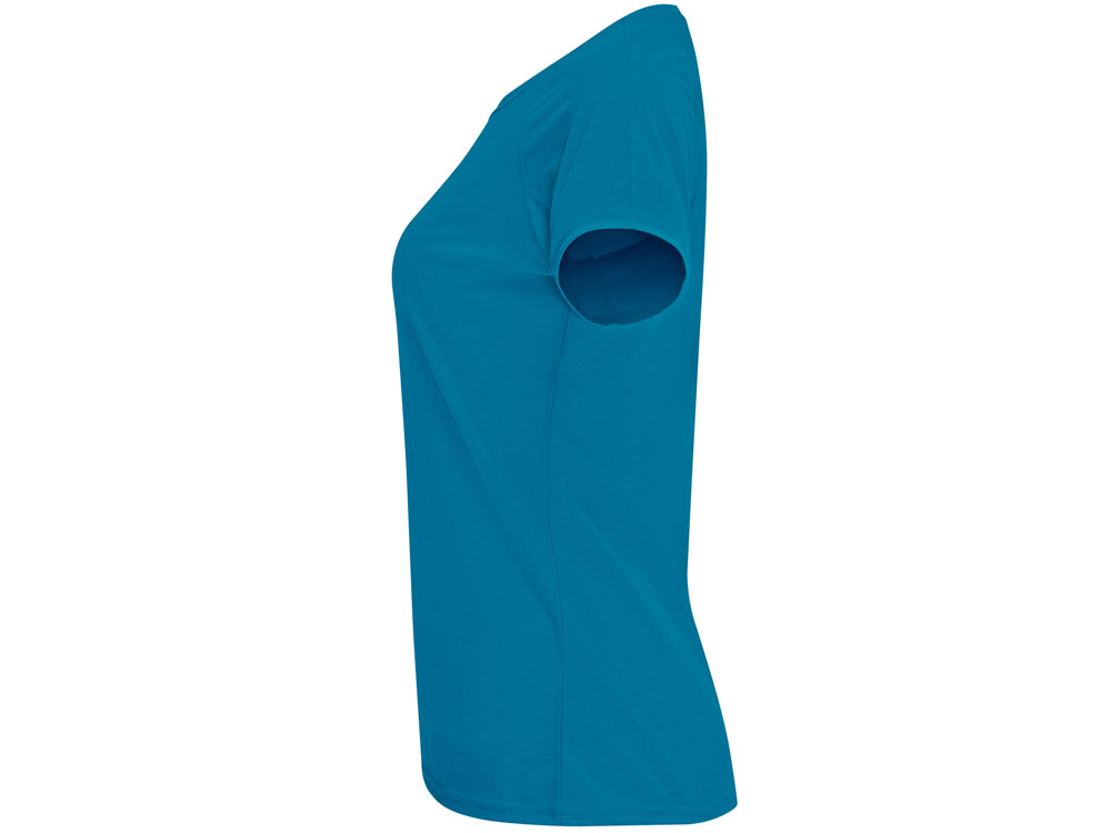 Спортивная футболка с коротким рукавом реглан для женщин. Круглый вырез горловины с отделкой плоским швом. Рукав сложного кроя для обеспечения дополнительного удобства при занятиях спортом. Отделка плоским швом с застилом по пройме и рукавам.