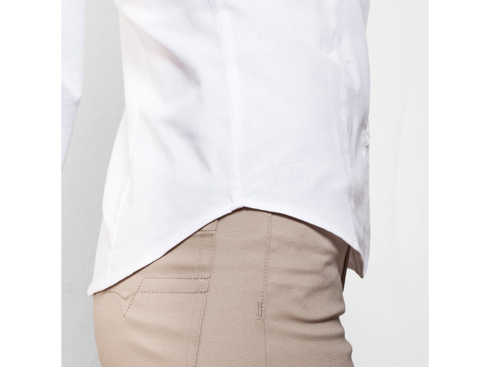 Женская рубашка с длинным рукавом, накладной карман слева. Планка на пуговицах. Отложной воротник на стойке, могут встречаться изделия, где воротник продублирован пуговицами. Манжета регулируется по ширине с помощью 2-х пуговиц. Кокетка на спинке. -