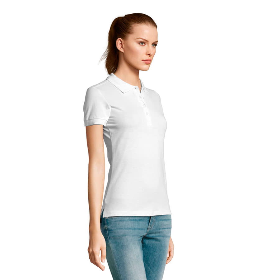 Приталенное женское поло.Прямой низ, боковые разрезы. Рукав короткий.Воротник и манжеты из эластичной резинки-рибаны.Ворот укреплен тесьмой.4 пуговицы в тон изделия на планке.Запасная пуговица на внутреннем боковом шве. -