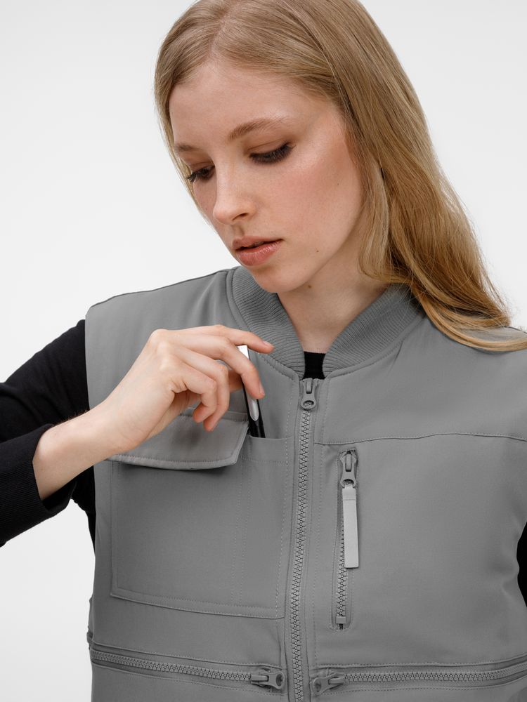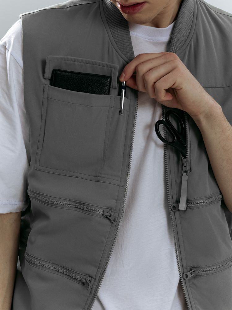 - 8 функциональных карманов, из них на передней части: 1 карман с клапаном для документов/рации, 1 карман для ручки, 5 вместительных на молнии, а так же 1 карман под планшет на молнии на спинке жилета