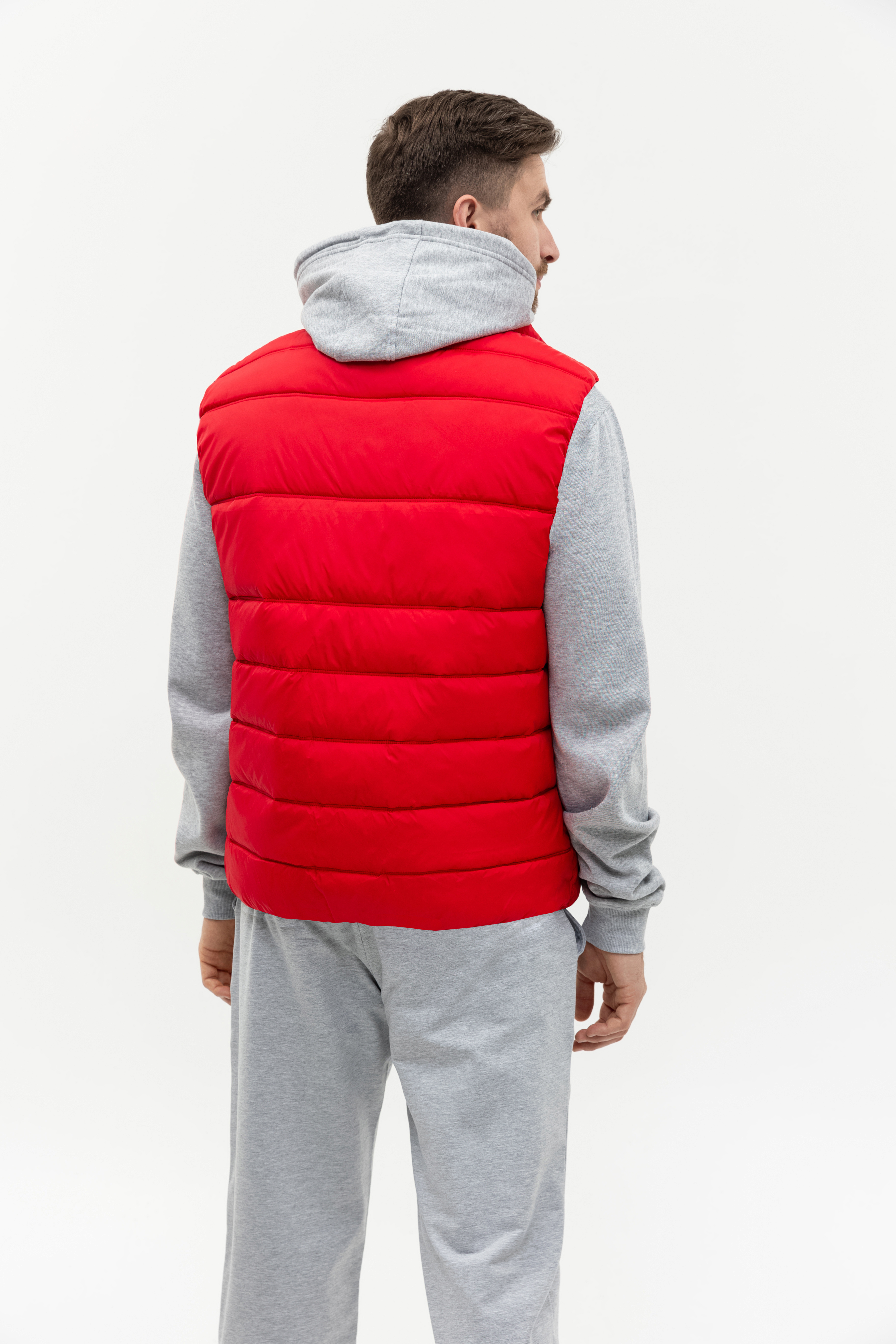 Мужской жилет прямого силуэта с геометричной стежкой, воротником-стойкой, прорезным карманом и застежкой на молнию. Изделие дополнено резинкой по пройме и линии низа для дополнительной защиты от холода и ветра.