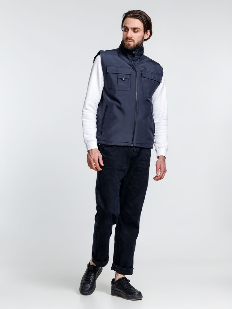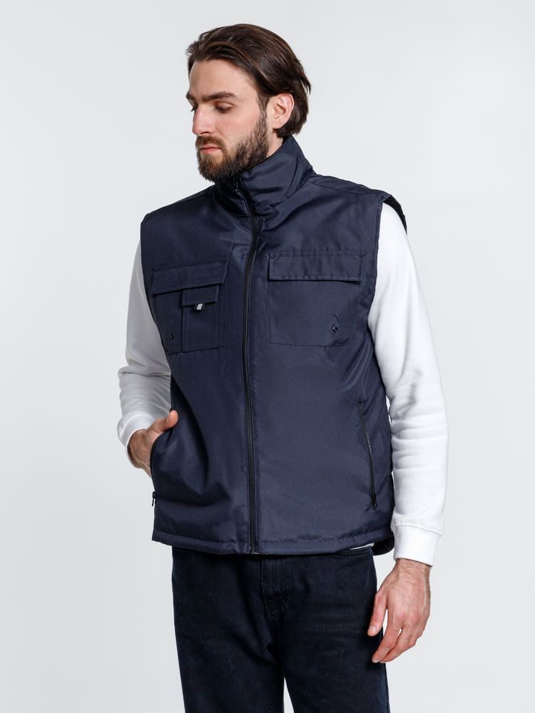 Мужской утепленный жилет с воротником-стойкой и удлиненной спинкой. Выполнен из ткани оксфорд с водоотталкивающим покрытием.- Воротник-стойка на флисовой подкладке