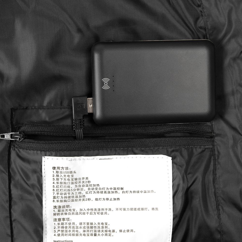 При использовании аккумулятора емкостью 10000 мАч нагревательный элемент будет работать от 6 до 12 часов в зависимости от выбранного режима работы и температуры окружающей среды.- Жилет на молнии с воротником-стойкой и 2 наружными карманами