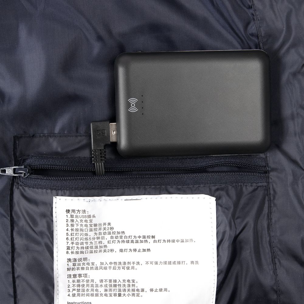 При использовании аккумулятора емкостью 10000 мАч нагревательный элемент будет работать от 6 до 12 часов в зависимости от выбранного режима работы и температуры окружающей среды.- Жилет на молнии с воротником-стойкой и 2 наружными карманами