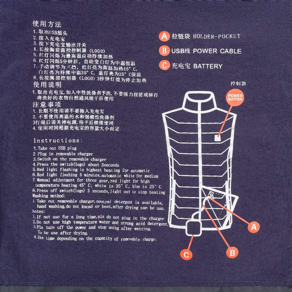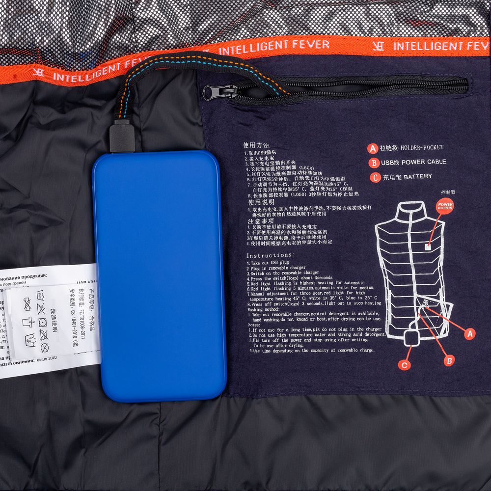 При использовании аккумулятора емкостью 10000 мАч нагревательный элемент будет работать от 6 до 12 часов в зависимости от выбранного режима работы и температуры окружающей среды.- Утепленный жилет на молнии с воротником стойкой и 2 наружными карманами