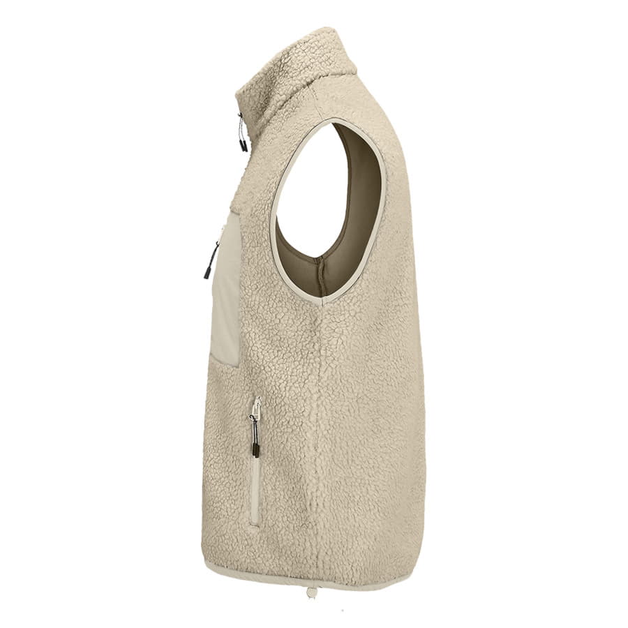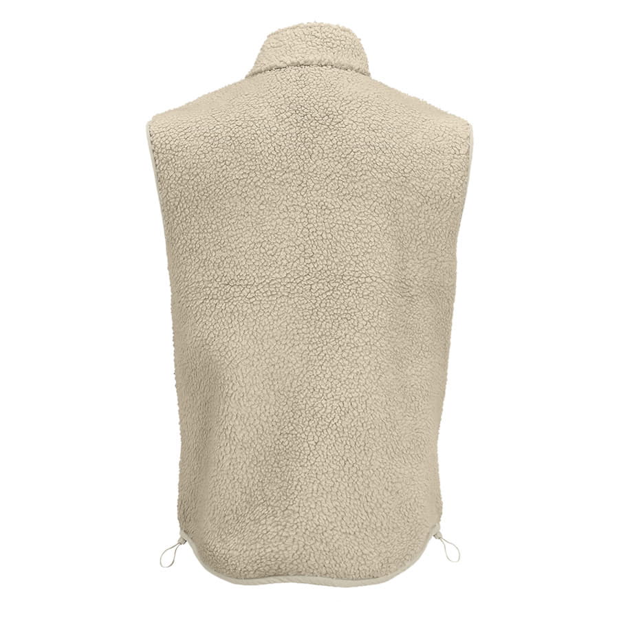 Жилет унисекс из искусственного меха шерпа с карманами на молнии: 1 нагрудным из таслана для нанесения логотипа и 2 боковыми. Черные пуллеры на молниях со светоотражающими элементами. Слегка удлиненная спинка. Эластичный шнурок по низу изделия. -