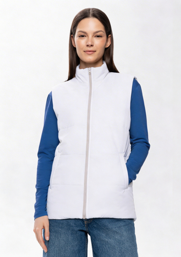 Утеплённый жилет полуприлегающего силуэта с воротником стойкой, центральной застежкой на молнию в тон основному полотну и прорезным карманом с листочкой. Подклад выполнен в цвет основного материала, утеплитель надежно зафиксирован прострочкой по груди и спинке.