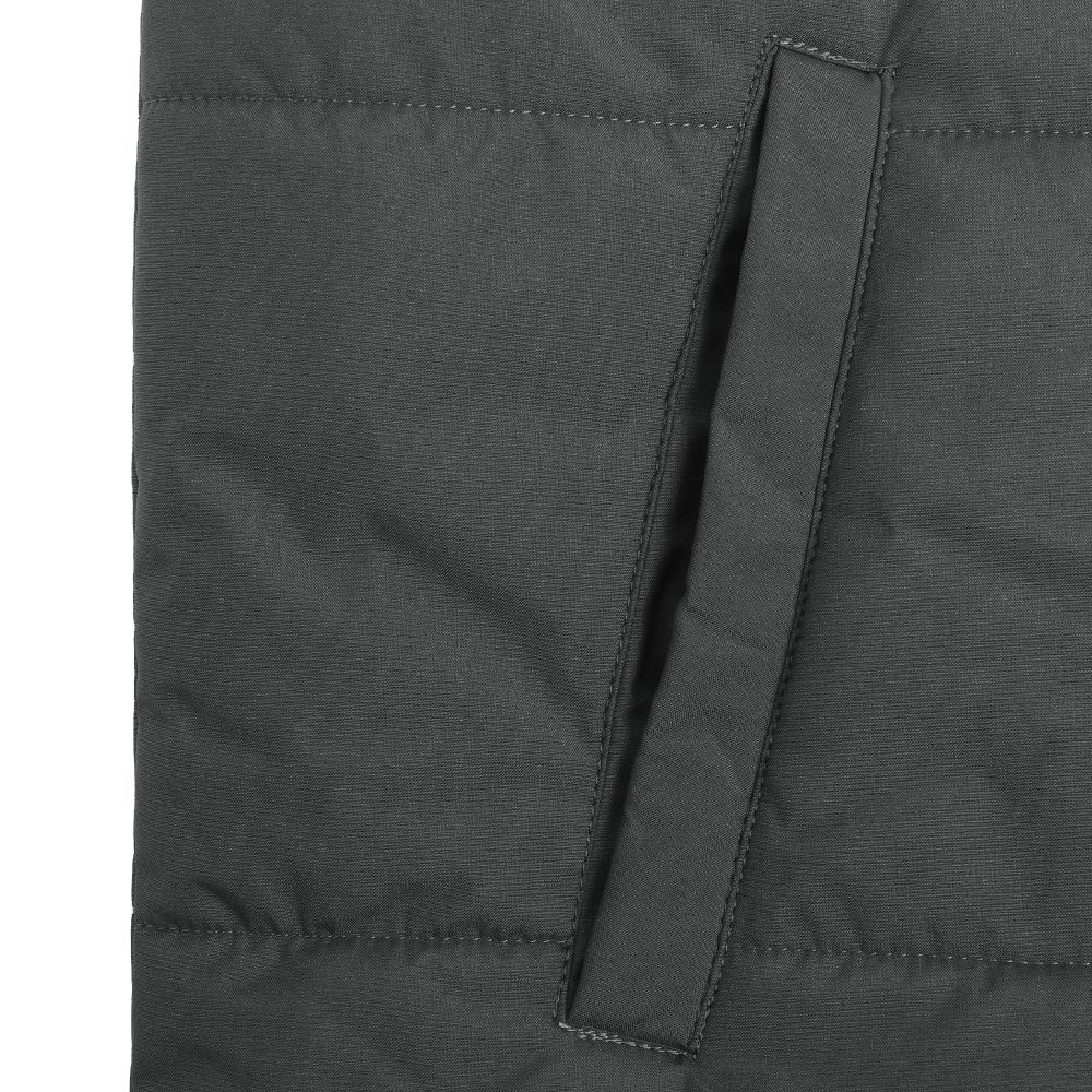 Утеплённый жилет полуприлегающего силуэта с воротником стойкой, центральной застежкой на молнию в тон основному полотну и прорезным карманом с листочкой. Подклад выполнен в цвет основного материала, утеплитель надежно зафиксирован прострочкой по груди и спинке.