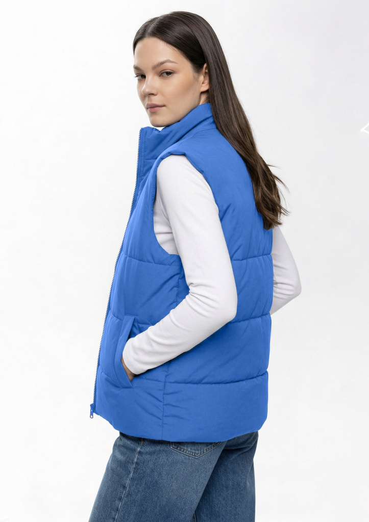 Утеплённый жилет полуприлегающего силуэта с воротником стойкой, центральной застежкой на молнию в тон основному полотну и прорезным карманом с листочкой. Подклад выполнен в цвет основного материала, утеплитель надежно зафиксирован прострочкой по груди и спинке.