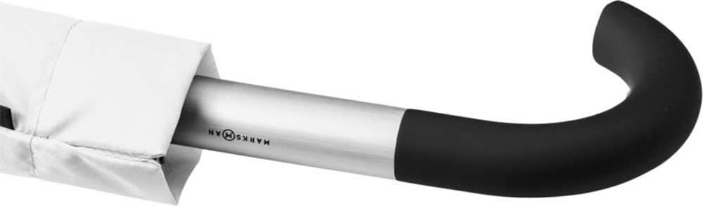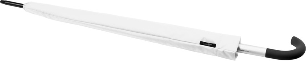 Эксклюзивный автоматический зонт. Металлическая трость и спицы. Специальная ручка, позволяющая вешать зонт на стол. Прорезиненная изогнутая ручка с алюминиевыми деталями. Чехол под цвет зонта. Полиэстер Эпонж. -