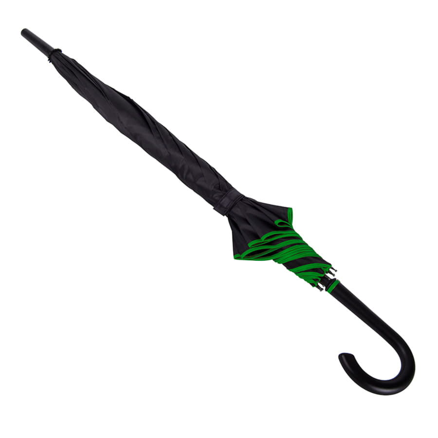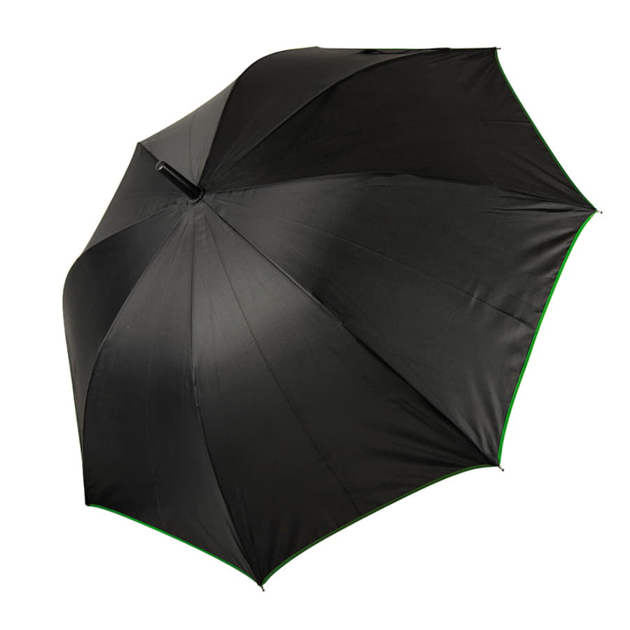 Зонт-трость с пластиковой ручкой, полуавтомат.Диаметр купола: 103 см, длина стержня 85 см.Состав купола: 100% полиэстер 190TСостав стержня: металл.Состав спиц: стекловолокно.Ручка пластик. Цвет купола: чёрный + кант зелёного цвета. -