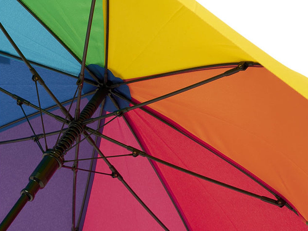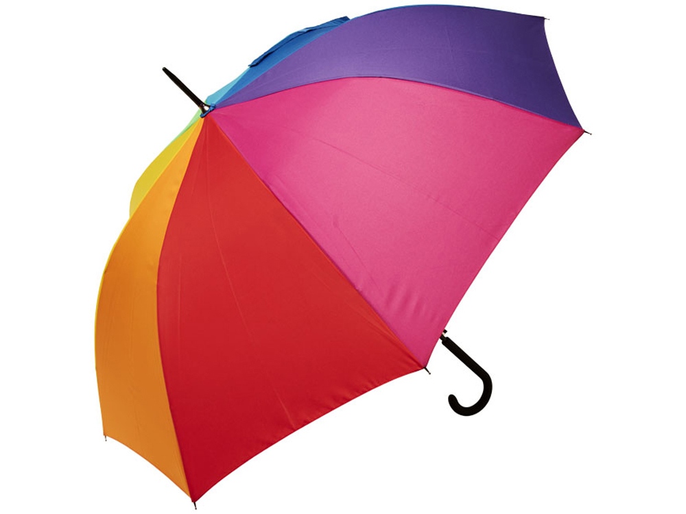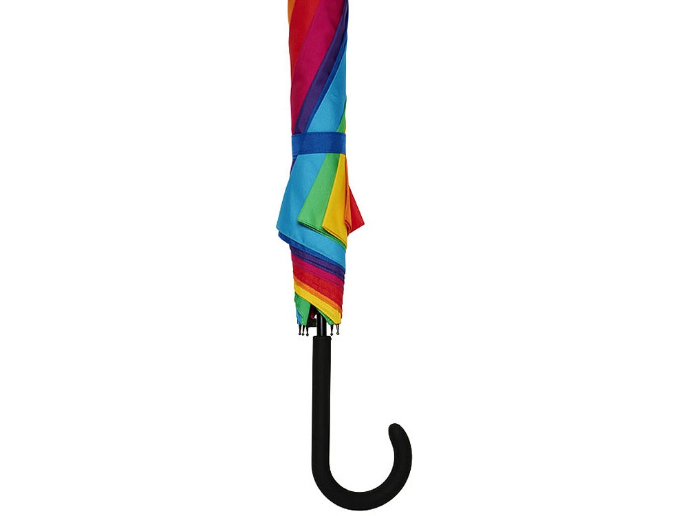 23-дюймовый ветрозащитный полуавтоматический зонт Sarah. Зонт с куполом из эпонж полиэстера, раскрашенный в цвета радуги. Прочный металлический стержень, высококачественная цельная рама из стекловолокна, обеспечивающая максимальную гибкость в ветреную погоду. Выгнутая ручка с мягким матовым покрытием, никелированные верхняя втулка и кончики спиц. Большая область для декорирования на каждой из панелей купола позволяет предложить различные креативные решения для логотипа. Эпонж полиэстер. -